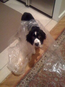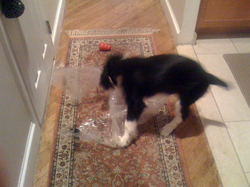 Today, Riley “helped” Mommy with switching her closets over to her winter wardrobe… by “killing” the completely busted SpaceSaver bags (which, btw, I caution you against believing all of the hype on these – yes, conveniently puts everything in one place, but they are incredibly susceptible to tearing. I suppose the small, flat versions are probably fine, but the cubes are not hardy at all. And, frankly, if you have “too much stuff, not enough space”, perhaps it’s time to cull through all those “never wears” in your closet!). If you ask me, all SpaceSaver bags should be inspected by “#25” (literally, “lbs 25″… Riley the Ripper)! Please note: No animals were harmed during filming. 😉